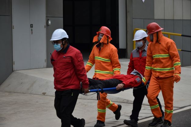消防演練正式開始,李總宣布啟動(dòng)“環(huán)保消防應(yīng)急預(yù)案演習(xí)”,接到2#倉庫火情報(bào)警信息后,立即啟動(dòng)應(yīng)急預(yù)案,各小組按應(yīng)急預(yù)案快速投入滅火、救治等工作中。通訊與警戒組現(xiàn)場進(jìn)行調(diào)度、警戒,并對火災(zāi)現(xiàn)場進(jìn)行封鎖。醫(yī)療救護(hù)組對傷員進(jìn)行轉(zhuǎn)移、臨時(shí)急救。搶險(xiǎn)搶修組身著滅火服對著火點(diǎn)實(shí)施滅火。
